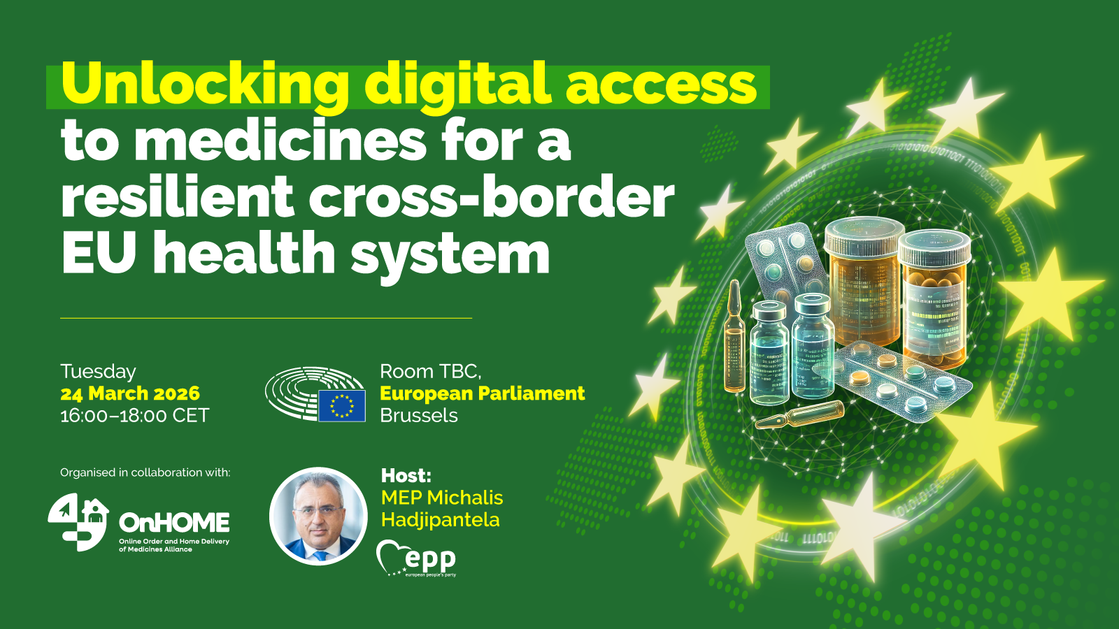 This in-person only event, hosted by MEP Michalis Hadjipantela (EPP, Cyprus) in collaboration with the OnHOME Alliance, aims to foster dialogue among policymakers, healthcare professionals, patient representatives, and industry stakeholders on advancing digital access to medicines for resilient cross-border EU health and will: